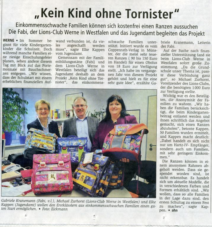 Gemeinsam mit der Familienbildungsstätte (Fabi) und dem Lions Club Werne in Westfalen beteiligt sich das Jugendamt deshalb an dem Projekt "Kein Kind ohne Tornister", das einkommensschwache Familien unterstützt. Initiiert wurde es vom Coppenrath-Verlag in Münster, der meist sehr teueren Ranzen (09 bis 150 Euro im Handel) für einen Obolus von 18 Euro zur Verfügung stellt. "Ich habe im vergangenen Jahr von diesem Projekt gehört und hielt es für eine sehr gute Idee", erzählte Gabriele Kranemann, Leiterin der Fabi.